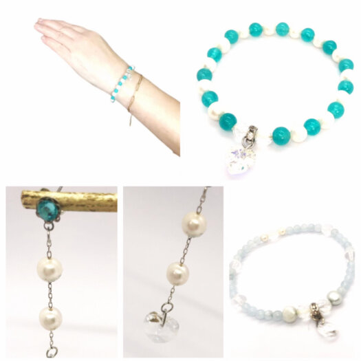 昼の特別な場面に相応しいアクセサリーとして、パールや淡水パール、淡いトーンのアクアマリン、ペールローズクォーツのパステルカラーが映えます。ネックレスやブレスレット!